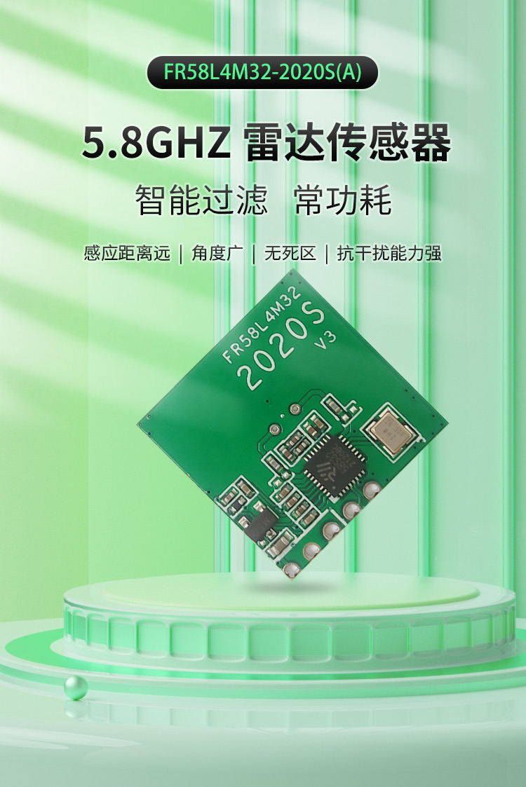 FR58L4M32-2020S(A)是飞睿智能推出的高性能 5.8G 雷达传感器,雷达模块利用多普勒原理,通过天线发射高频电磁波并接收初期反射波,以此判断覆盖范围内物体的移动,给出相应电信号。模块尺寸 20*20MM该芯片集成了 5.8G 微波电路、中频放大电路以及信号处理器,集成度高且生产一致性好,模块内置 32 位 MCU和收发天线,大大提高了传感器的感应性能。