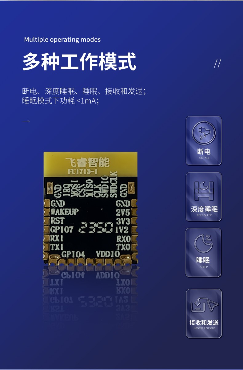 FU1713-1 集成了天线、RF 电路、电源管理和时钟电路。FU1713-1 可以用于双向测距或 TDOA 定位系统中,定位精度可达到 10 厘米,并支持850Kbps、6.8Mbps、7.8Mbps、27.2Mbps 及 31.2Mbps 的数据速率。